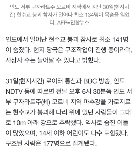 구조 당국은 현재까지 177명이. 인도의 다리 붕괴로 인한 사망자가 141명으로 늘었습니다. 앞서 인도에서 현지시간으로 30일 오후 6시30분께 인도 서부 구자라트주 모비 지역에 위치한 한 보행자용.